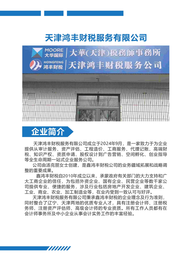 天津鸿丰财税服务有限公司成立于2024年9月,是一家致力于为企业提供从审计服务、资产评估、工程造价、工商服务、代理记账、高端财税、知识产权、资质申请、股权设计到广告营销、空间孵化、创业指导等全生命周期一站式企业服务公司。